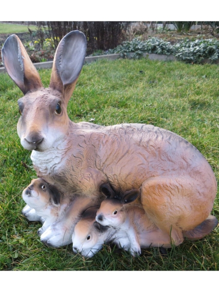 Hasenfigur Deko für den Garten: Häsin mit 3 Jungen, 35 cm lang.