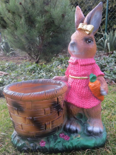 Osterhasenfigur Deko für den Garten oder Wohnung: Hasenmädchen mit goldener Schleife und Möhre neben einer Schale.