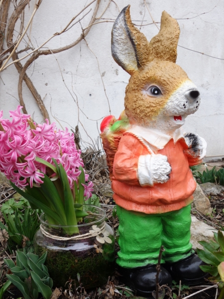 Die Osterhase Figur ist aus Polyresin und Naturkautschuk, wetterfest und langlebig.