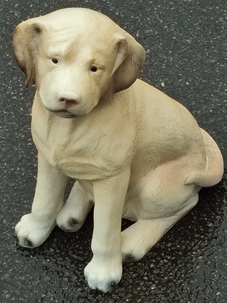 Eine herzige Gartendeko oder Wohnungsdeko: kleine Hundefigur sitzender Labrador Retriever Welpe.