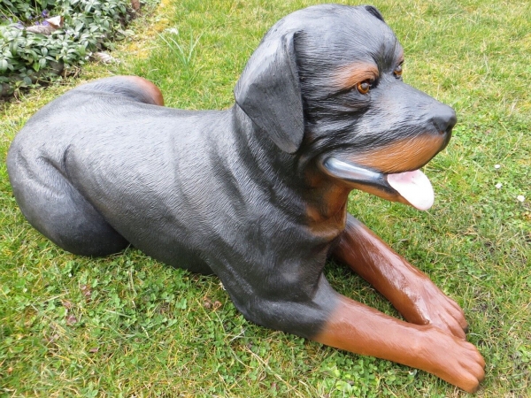 Eine wunderschöne Wohnungsdekoration oder Gartendekoration: Dekofigur Hund liegender Rottweiler.