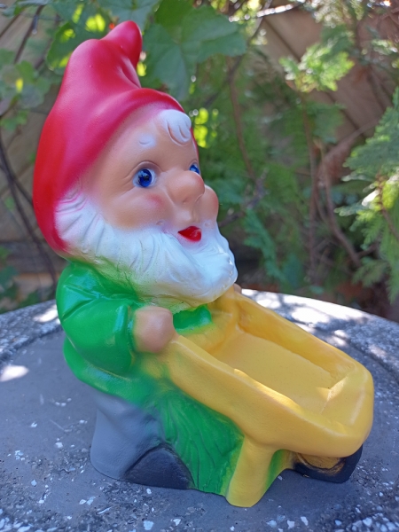 Kleiner Gartenzwerg mit Schubkarre, der Ihnen im Garten gerne zur Hand gehen würde.