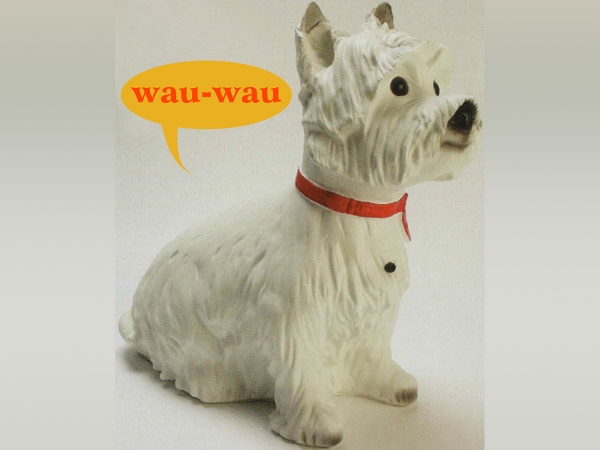 Die sitzende Hundefigur eines West Highland White Terrier, "Westie" bellt, wenn ihr jemand zu nahe kommt.