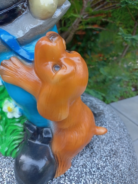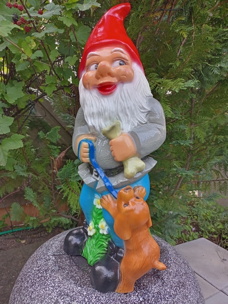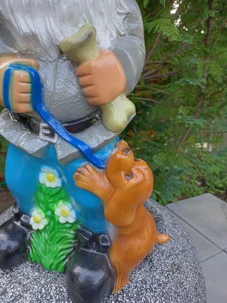 Grosser Gartenzwerg XXL mit Hund, der um den Knochen bettelt