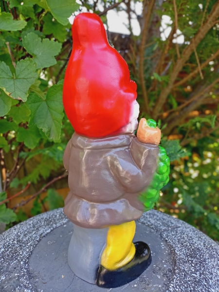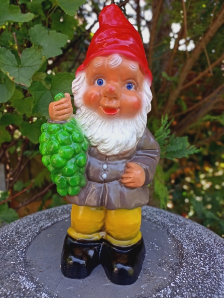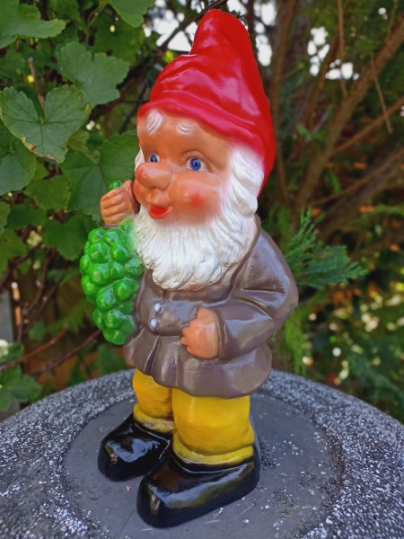 Schöner Gartenzwerg mit Trauben als Deko für Ihren Garten.