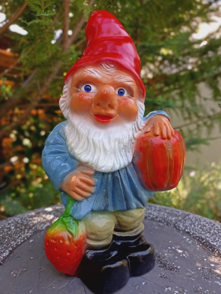 Gartenzwerg mit Kürbis und Erdbeere als Gartendekofigur im Gemüsebeet