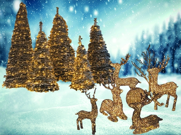 LED Rentiere outdoor und beleuchtete Weihnachtsbäume indoor