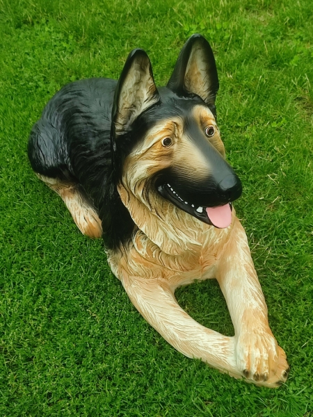 Der liegende Deutscher Schäfer, Hundefigur Deko als Wohnungsdekoration oder Gartendekoration ist gewiss ein Blickfang.