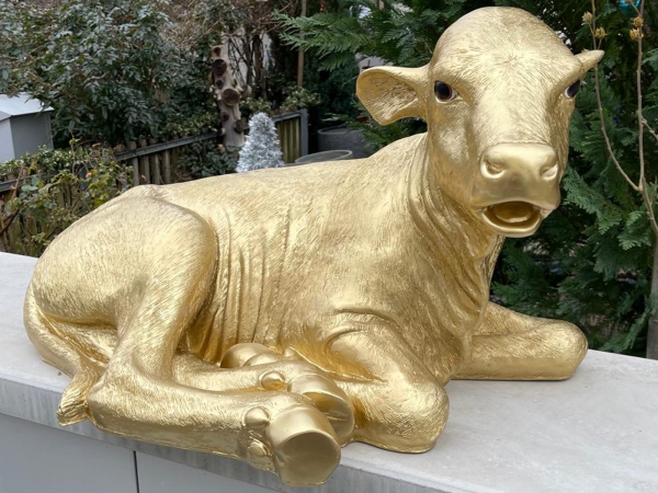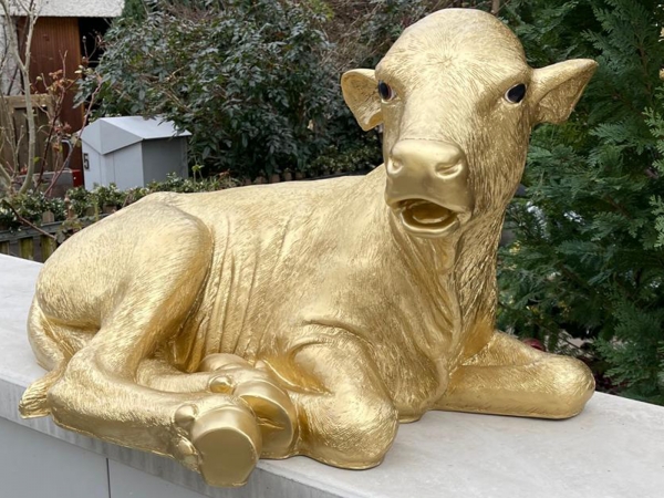 Goldenes Dekokalb lebensgross, liegend, als Gartenfigur